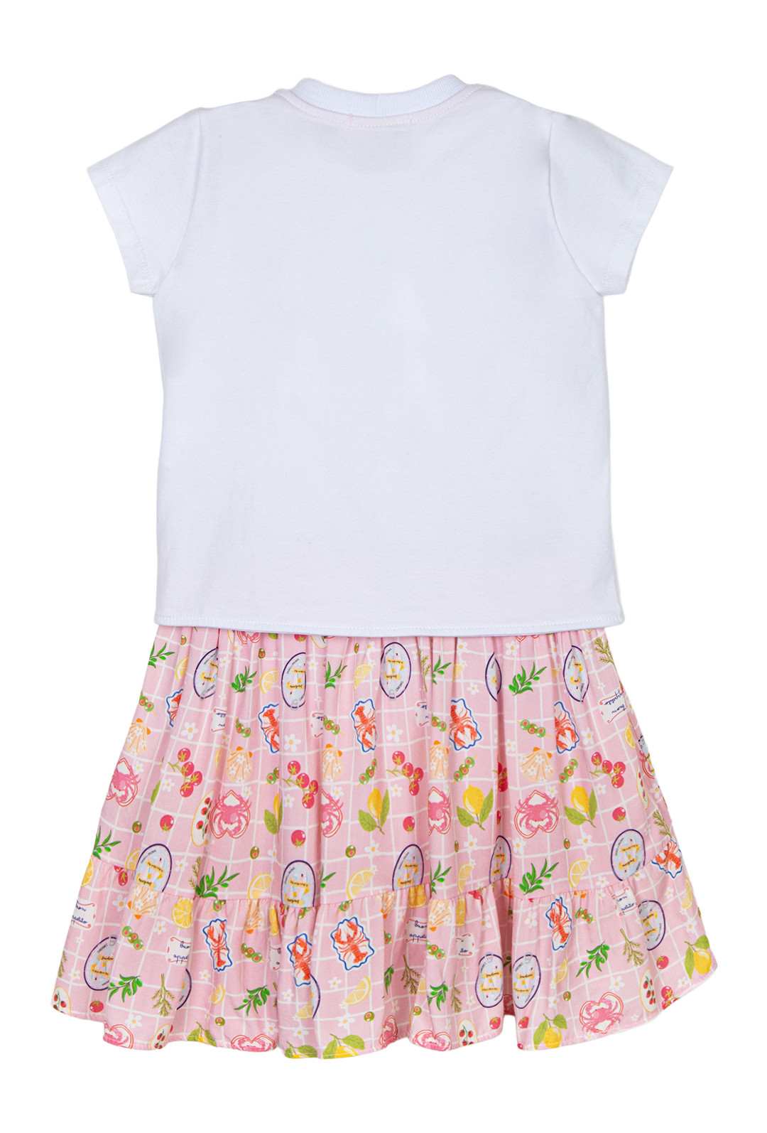 Saia em tecido plano 100% viscose, com babado na barra e estampa inspirada no verão italiano, repleta de frutas, sardinhas (super trendência!) e cores vibrantes que traduzem leveza e alegria. Possui shorts de algodão embutido, garantindo conforto e segurança durante as brincadeiras.