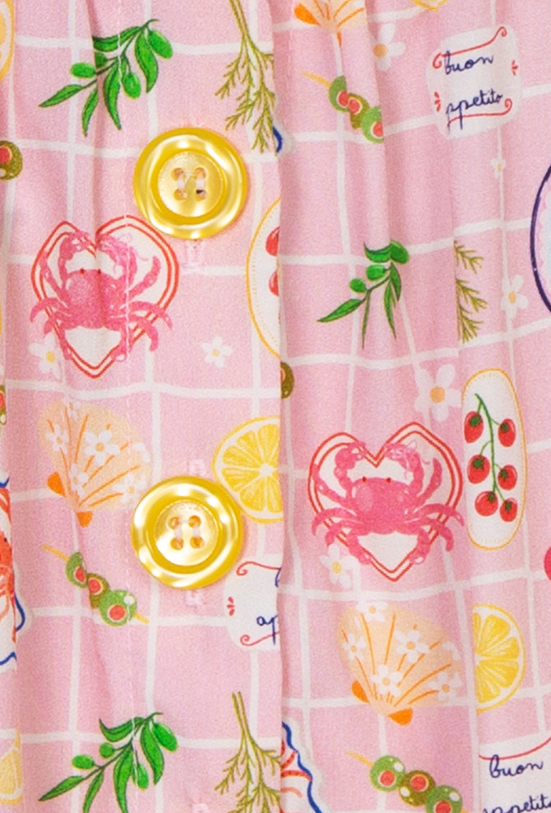 A estampa inspirada nos verões italianos, com frutas, sardinhas (super tendência!) e elementos delicados, traz alegria e leveza ao look, deixando tudo ainda mais encantador.
