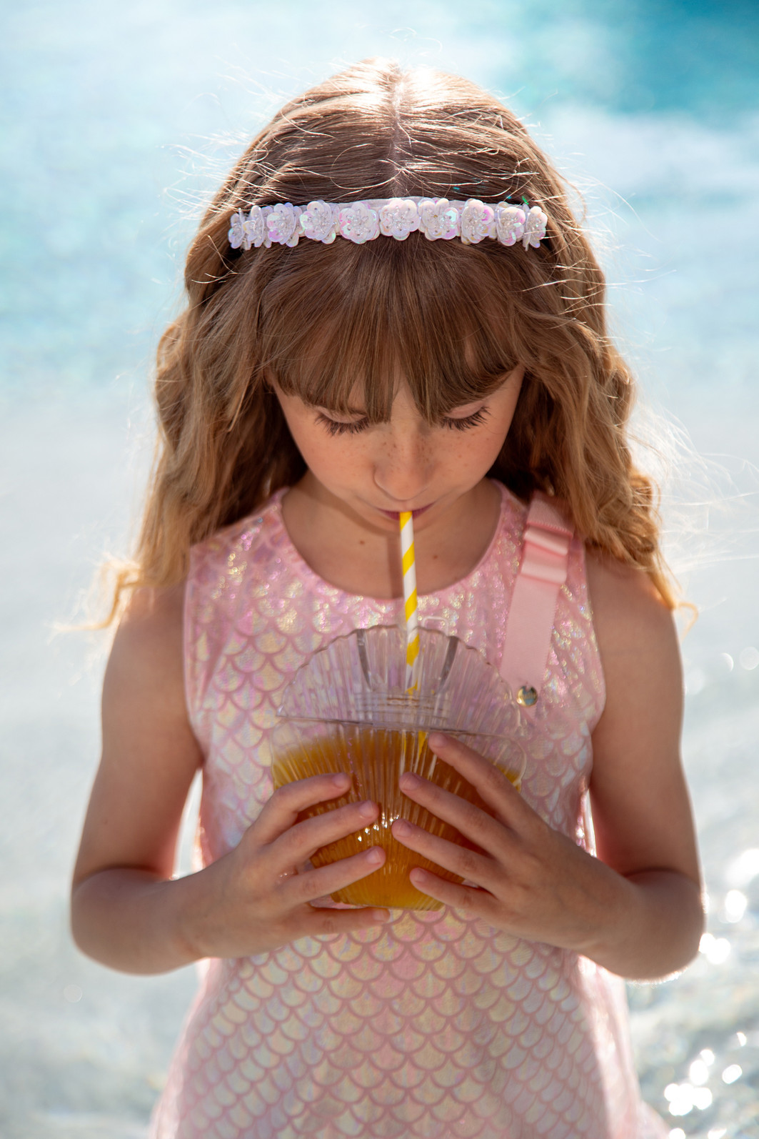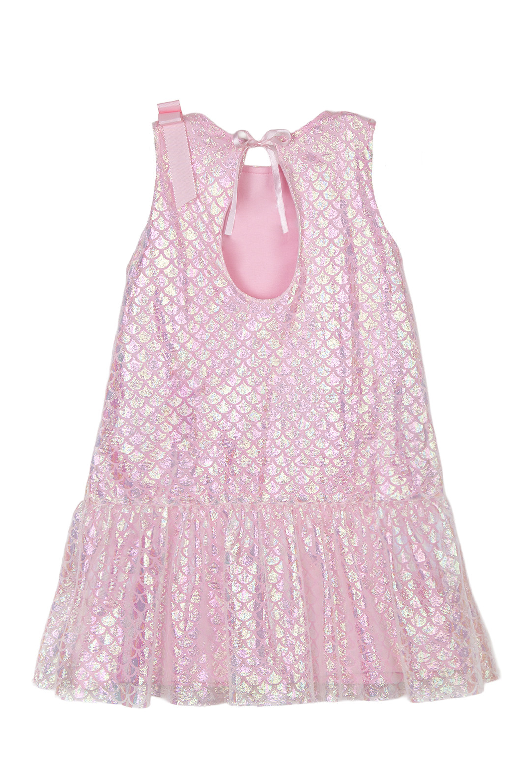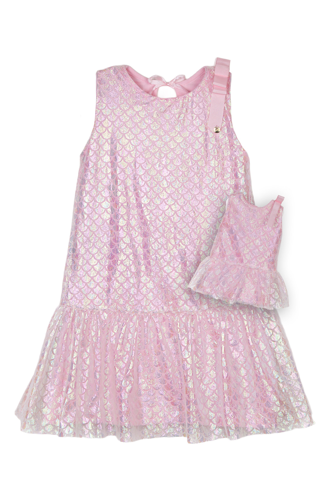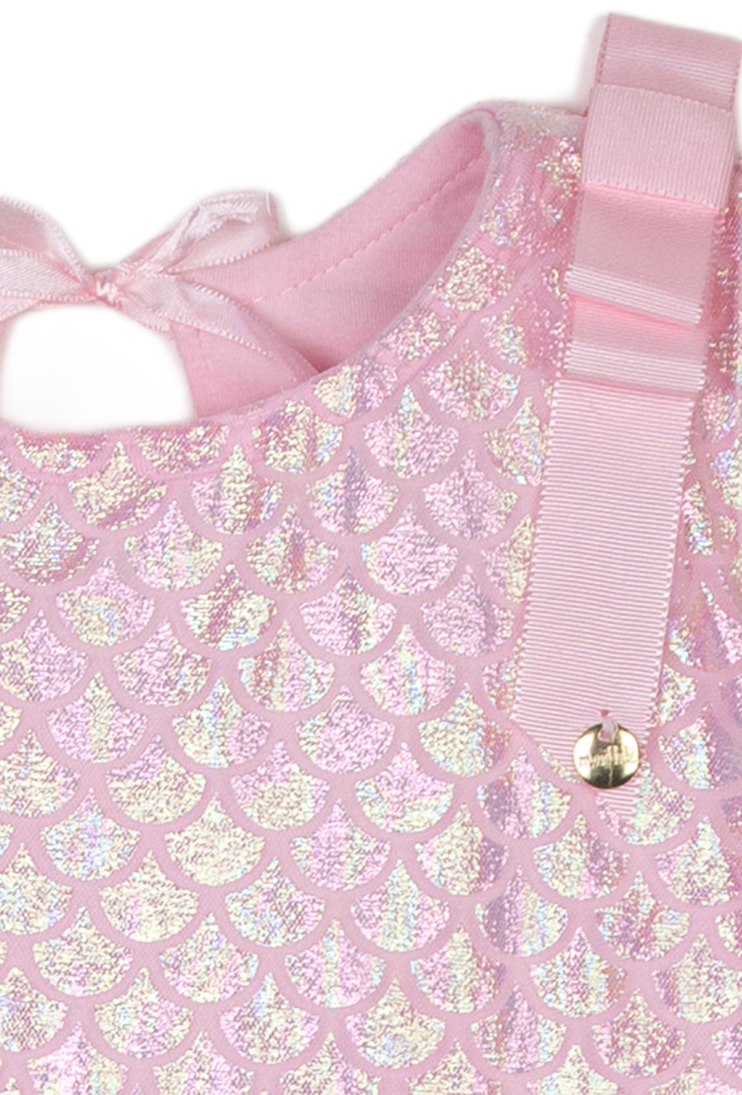 Forrado em cotton de algodão com elastano para máximo conforto, o vestido possui camada externa em tule com estampa holográfica de escamas de sereia, que reflete a luz e cria um brilho encantador. O laço de gorgurão no ombro, com plaquinha da Marthiê, adiciona um toque delicado e sofisticado.